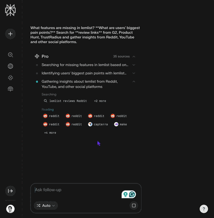 ↳ Use Perplexity to pull Reddit threads, social threads, and YouTube testimonials (use the "focus mode" and toggle the "social" button)