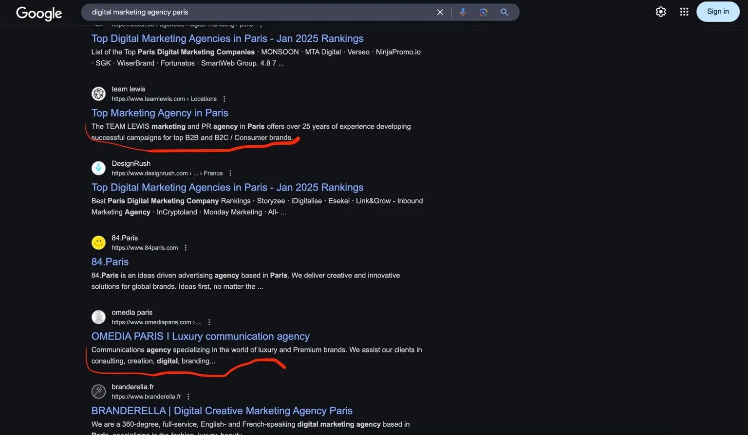 - Jump on Google, search for things like "digital marketing agency (your location)" (skip the ads!), and check out the top agencies. Try other searches too – "digital marketing services," "social media management," "SEO agency near me," "PPC advertising." Look for “well-ranked” meta descriptions that make you think "That's exactly how I want to sound!"