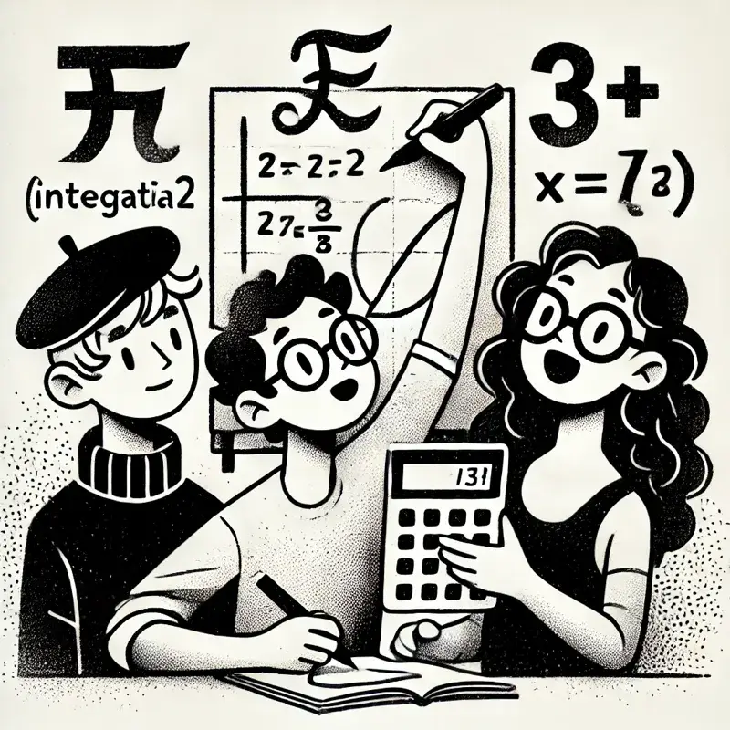 - Visuals: This black-and-white illustration shows three characters engaged in creative or educational activities. The left figure, wearing a beret, appears to be drawing or writing. The center figure holds up a board with mathematical symbols, while the right figure, with glasses and curly hair, excitedly reaches toward floating icons like text, a list, and a face. The style is playful and dynamic, emphasizing creativity and learning.