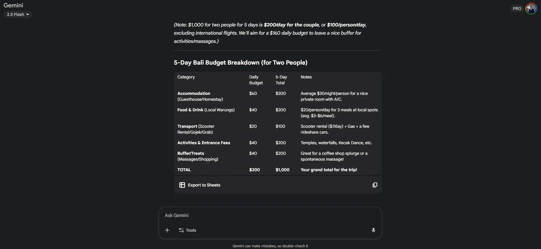 “You are a travel planner. Suggest a 5-day Bali itinerary under $1,000 for two people. Use a casual tone. Include daily budgets, transport tips, and 3 food spots per day.”