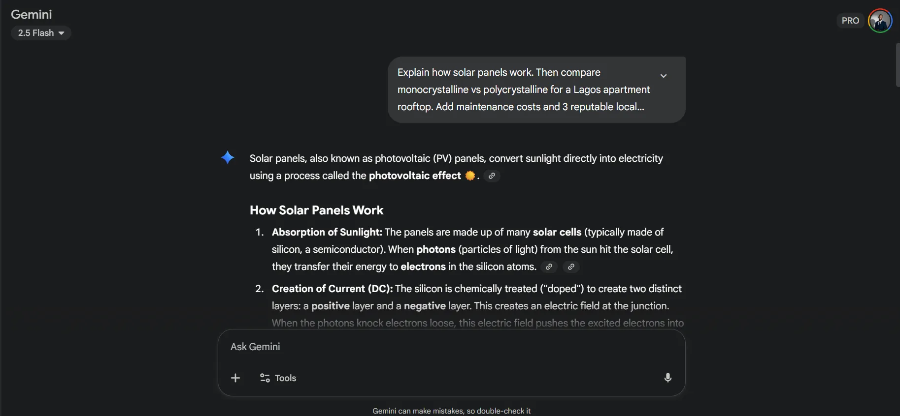 “Explain how solar panels work. Then compare monocrystalline vs polycrystalline for a Lagos apartment rooftop. Add maintenance costs and 3 reputable local installers.”