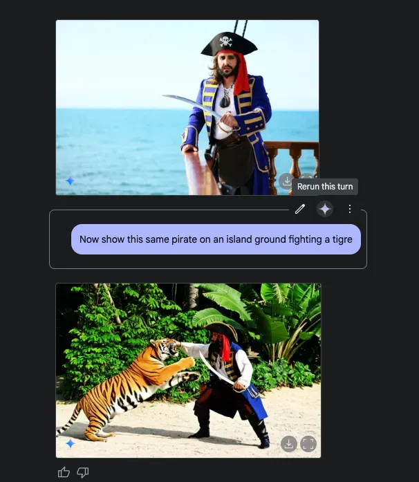 “Show a pirate on a ship, then on an island fighting a tiger!”