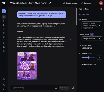 This is a killer prompt: “Generate a cartoon story about a group of wizards fighting in a alien planet. For each scene, generate an image.”