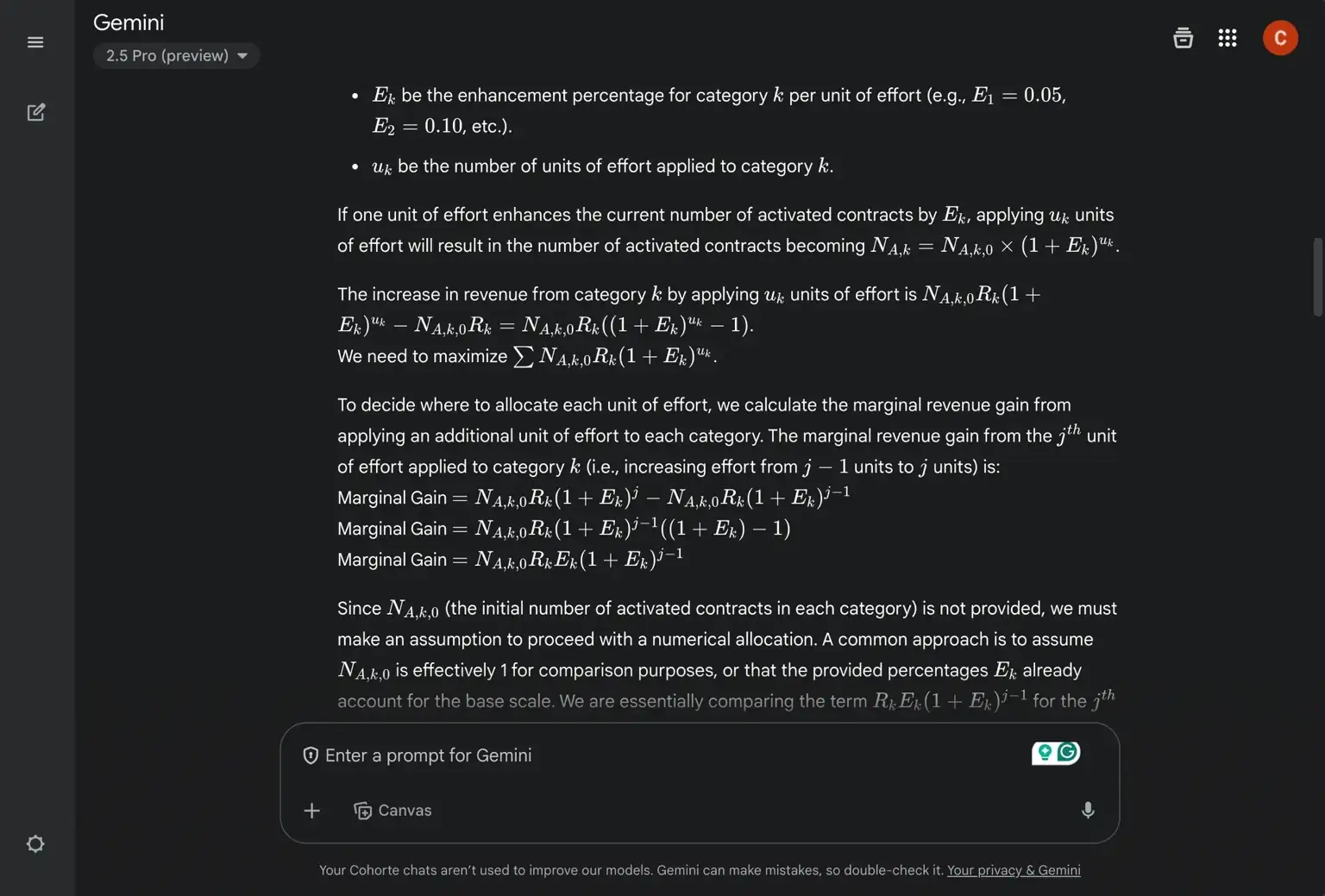 Problem#2: “You're working for a bank to enhance performance of a corporate credit options product. The bank only makes money when a contract is activated. Total signed contracts consist of active contracts (which generate profit) and inactive contracts. Given that you have access to both the average revenue per activated contract and the average cost per contract, what is the formula for profit per signed contract? Assume we have 4 contract categories.The average revenue per activated contract is $2,500, $1,000, $200, and $200 respectively. One unit of effort can enhance the number of activated contracts by 5%, 10%, 2%, and 40% respectively across the categories, while the total number of signed contracts remains the same. We have only 4 units of effort to spend with a 40% probability and only 3 units with 60% probability. We can’t use all the unit on one category. What's the best allocation of effort across categories to maximize the profit per contract?”
