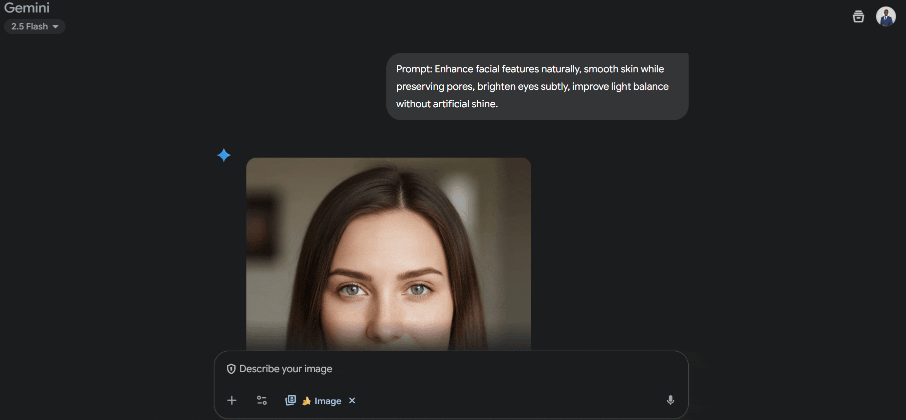 Prompt: Enhance facial features naturally, smooth skin while preserving pores, brighten eyes subtly, improve light balance without artificial shine.