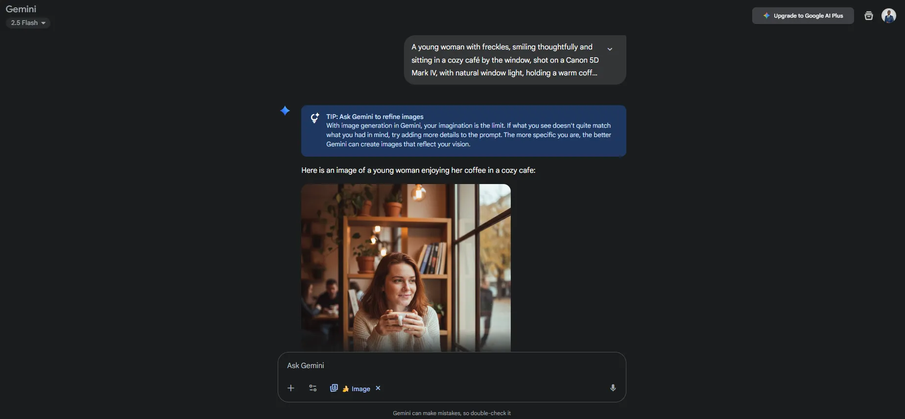 Prompt: A young woman with freckles, smiling thoughtfully and sitting in a cozy café by the window, shot on a Canon 5D Mark IV, with natural window light, holding a warm coffee cup with soft focus background.