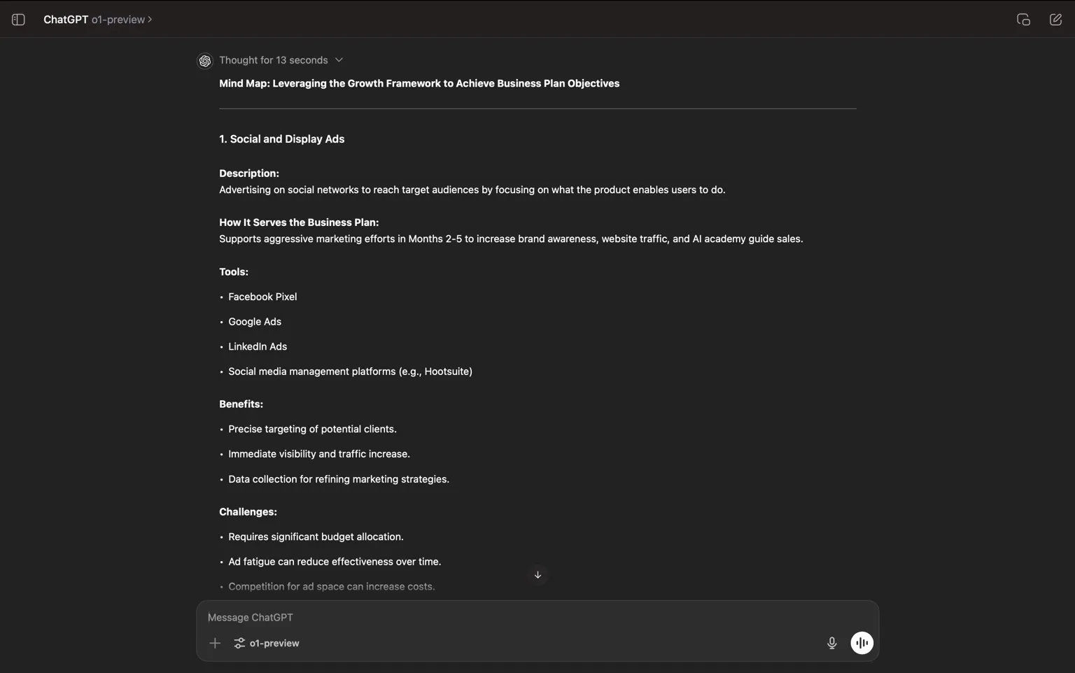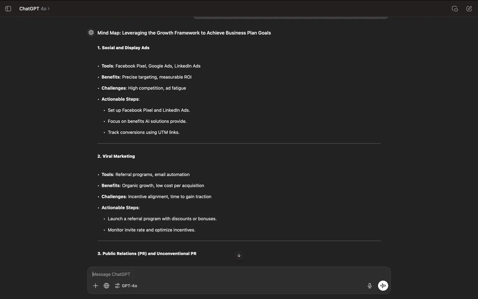 Here I give ChatGPT 4o (the free version) two distinct inputs (business plan + growth framework) and explaining the relationship between them, I explained what I want.