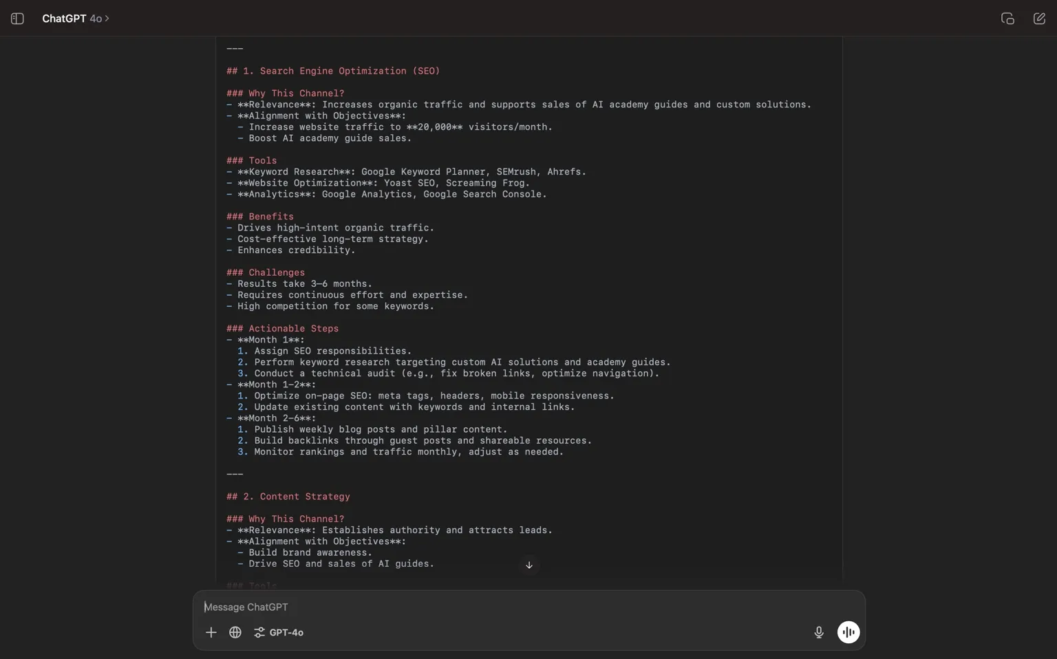 - Focus: I asked ChatGPT to filter out irrelevant acquisition channels and focus only on those directly aligned with my business plan.