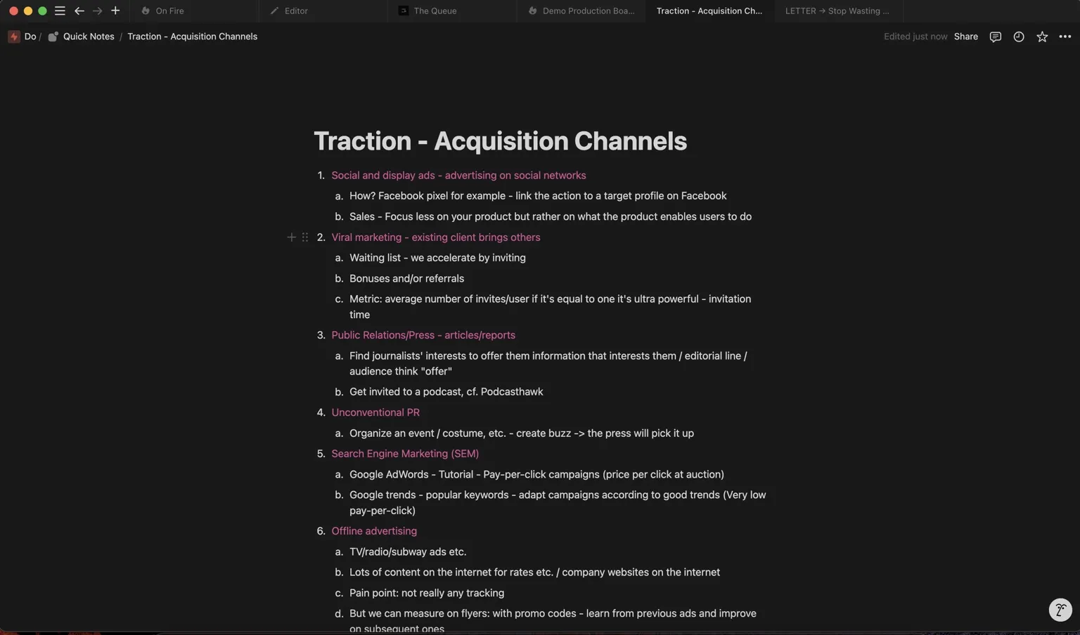A summary of the 19 marketing channels for acquiring customers. Great ideas, but disorganized—just a wall of text.