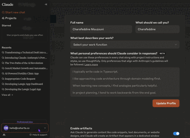 - Artifacts (lets Claude create separate workspaces for longer outputs)