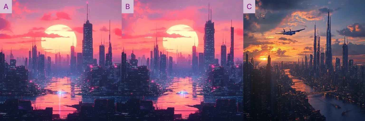 👉 A) “A futuristic city skyline, sunset --seed 12345”