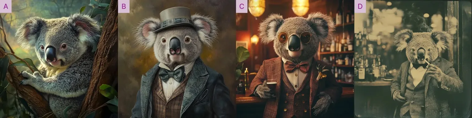 👉 C) Keep tweaking: “A koala dressed like a gentleman, standing outside a bar”