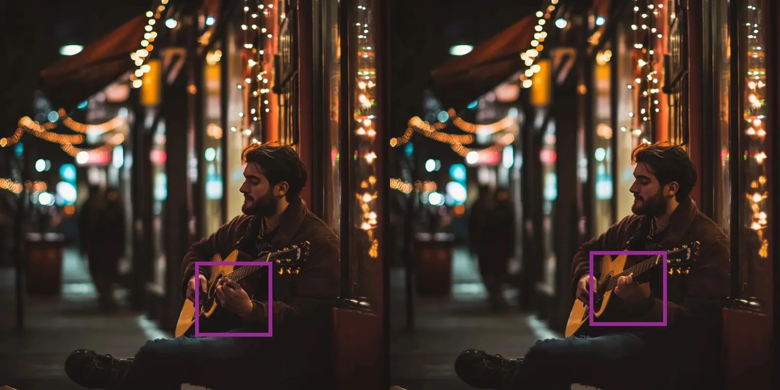 👉 B) “A dimly lit street at night, a guitarist is strumming” (focuses on the environment)