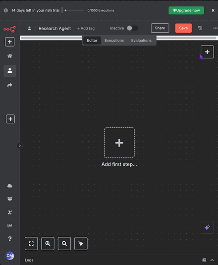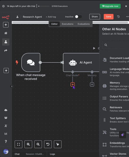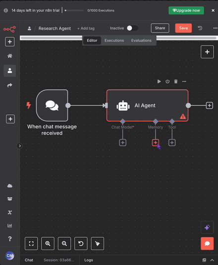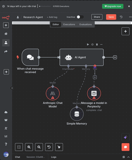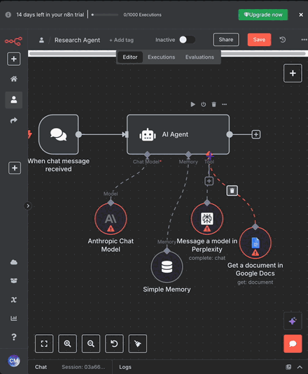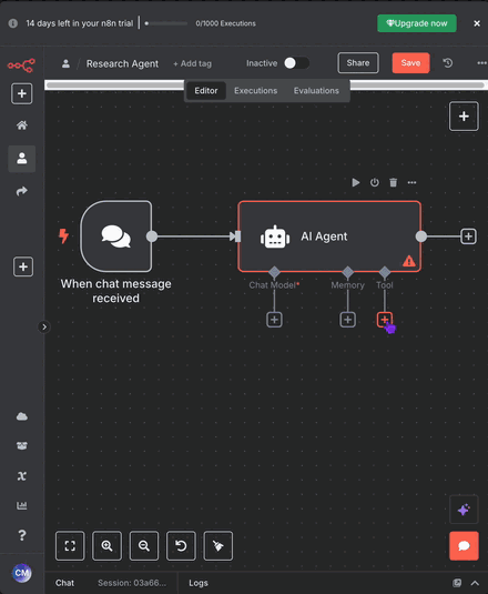 (I'm using the SaaS free version for demonstration purposes and I haven't added my credentials. Once your API keys are active, all your tools will be up and running and you can simply test your agent)
