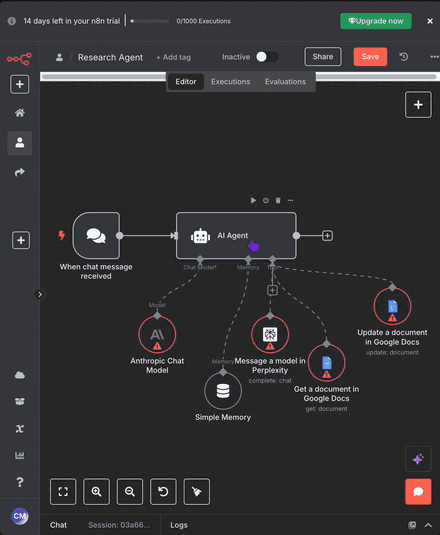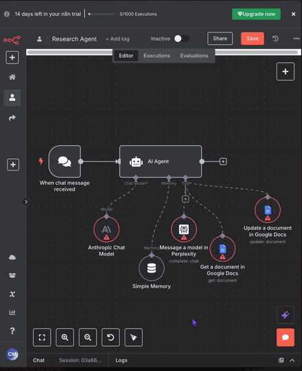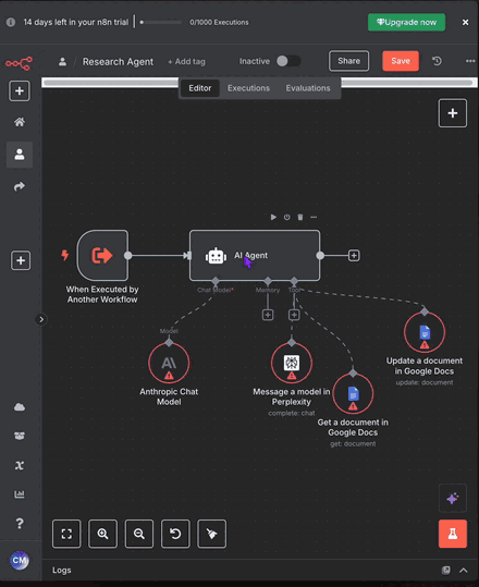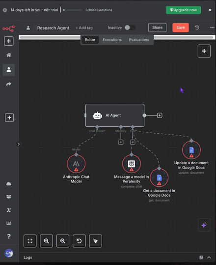 → Now I can add another node to create a Google Drive document whenever the research is completed. I can either update an existing document or create a new one for each research. It's pretty straightforward on n8n ↓