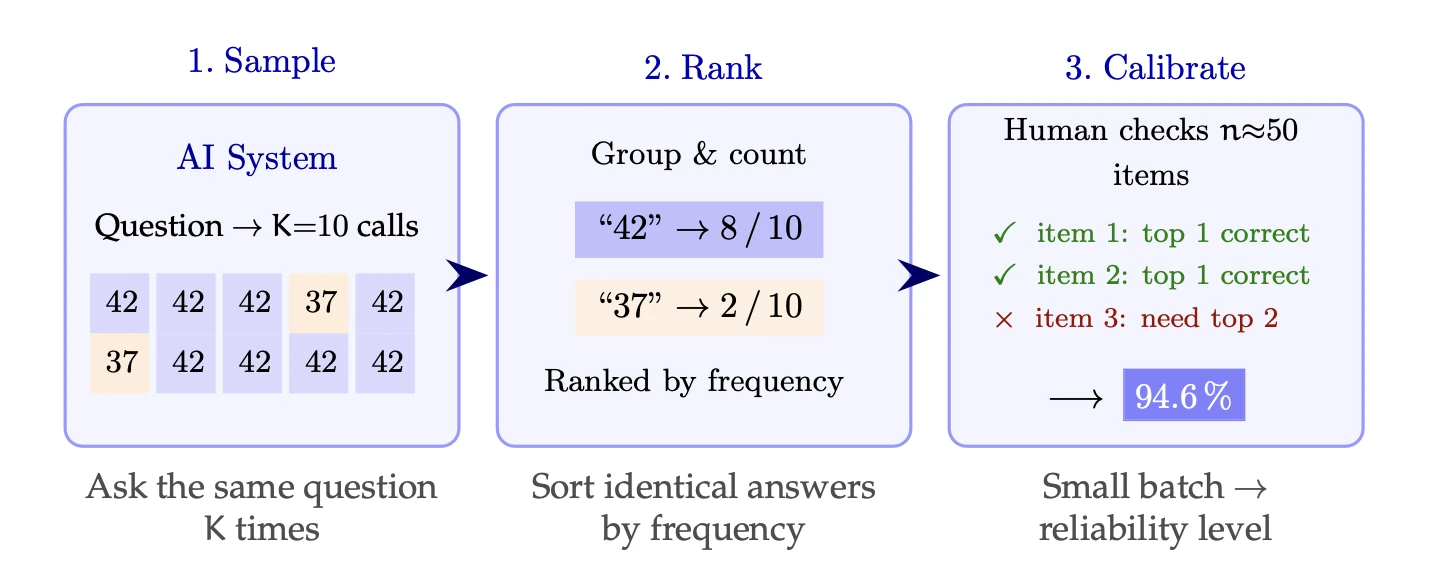 The reliability framework is what happens when you take that judgment and give it a mathematical backbone. The human still provides the ground truth — 50 checks, a few seconds each. The math provides the guarantee. The AI provides the output.