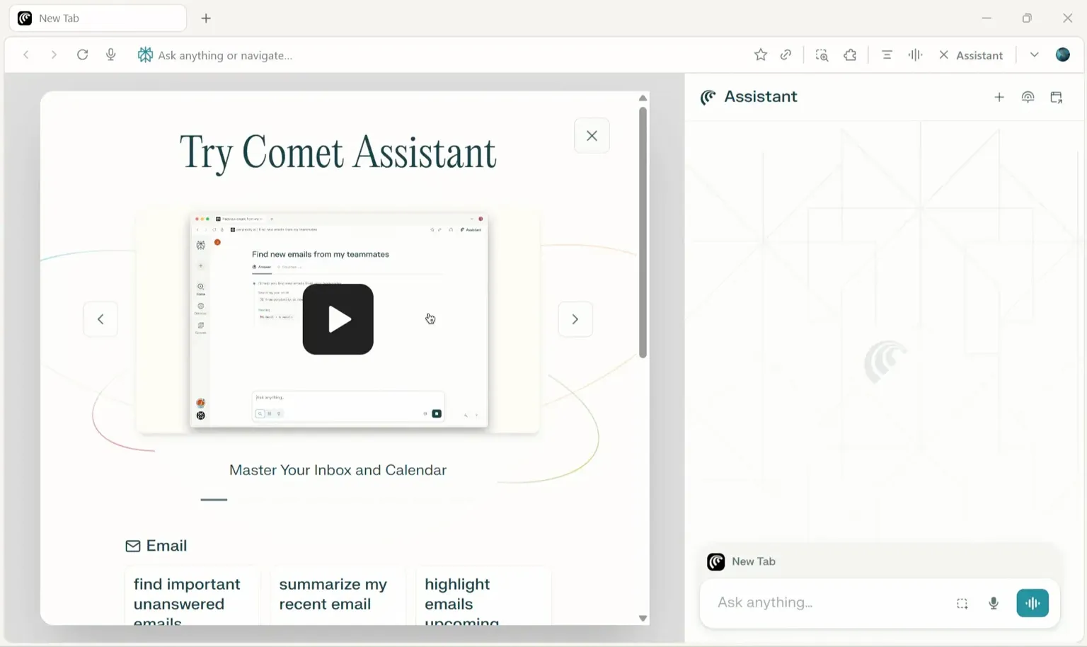 Day 1: Install Comet. Learn the sidebar vs main chat.