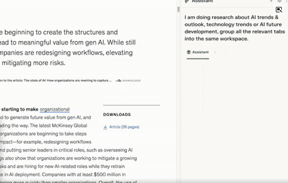 What it does: Groups your open tabs into a workspace, reads everything, then synthesizes themes, implications, and gaps.