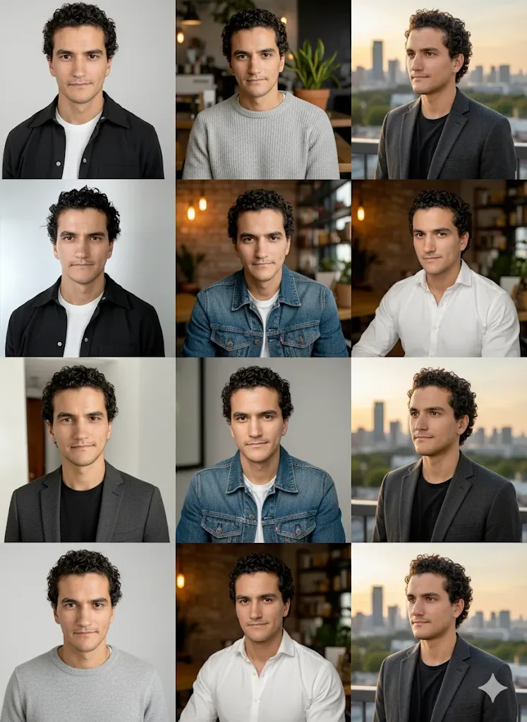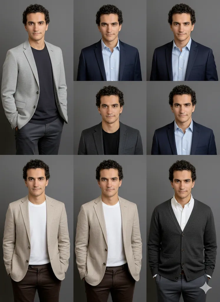 - Prompt: “Same person, neutral expression, business-casual suit, soft studio lighting, gray backdrop, 4 variants.”