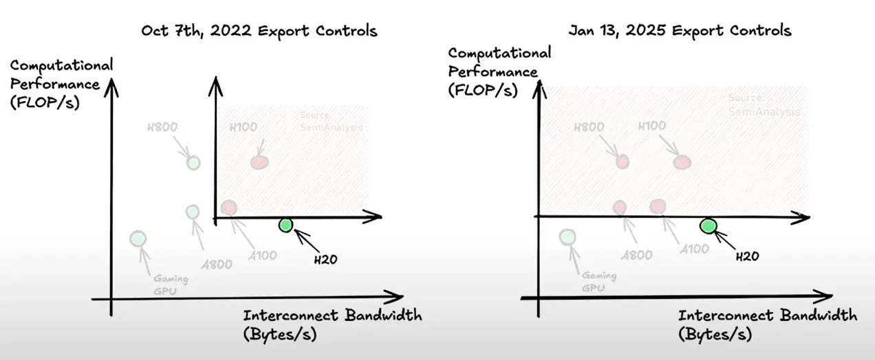 Translation: The US is trying to slow China from training and running the biggest, brainiest AI systems by limiting total compute that reaches Chinese labs and data centers.